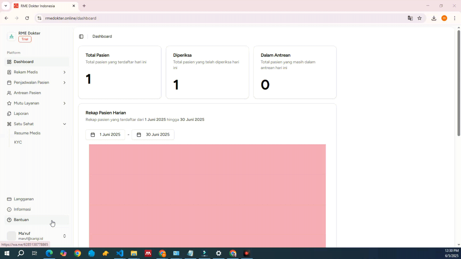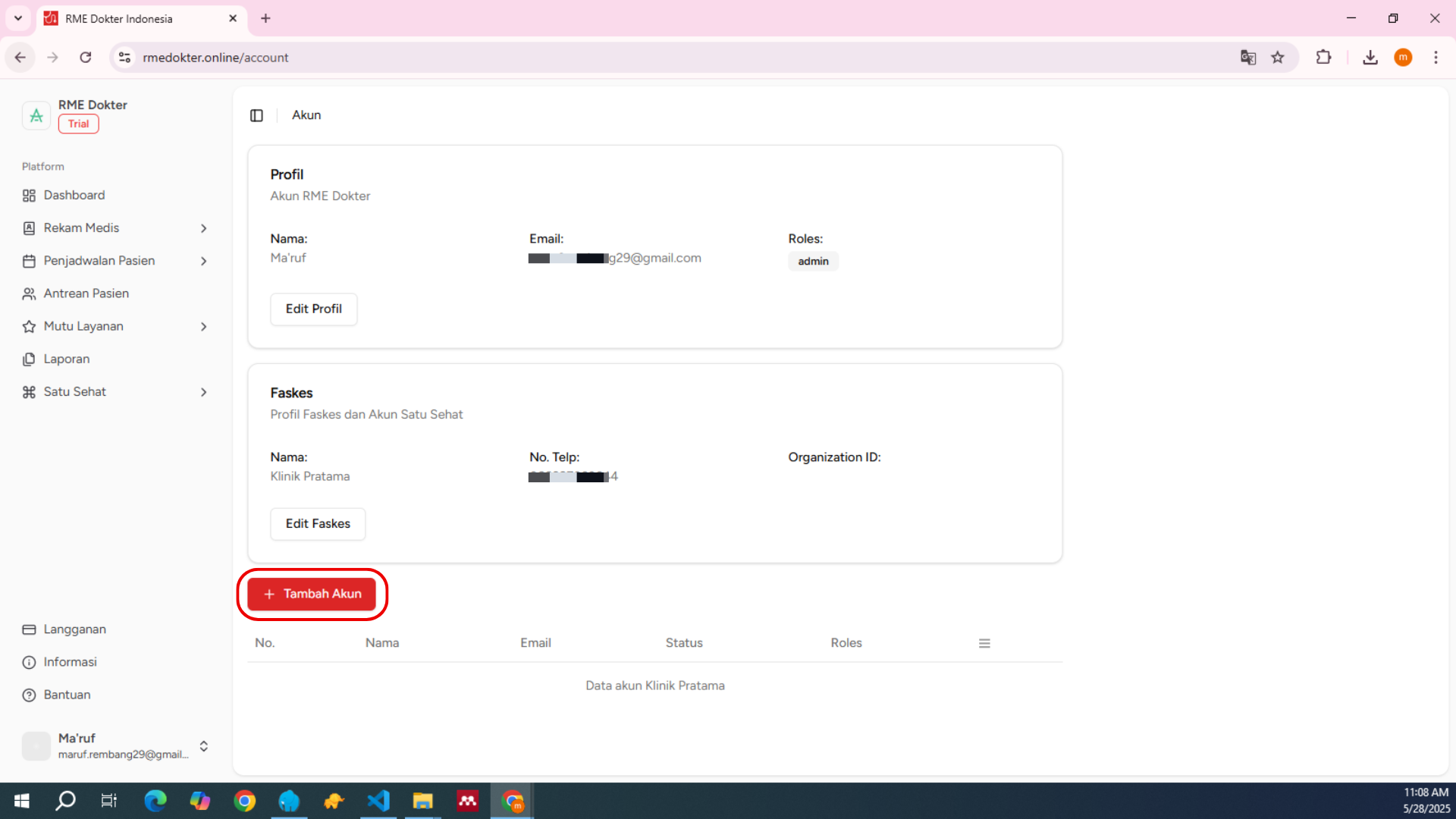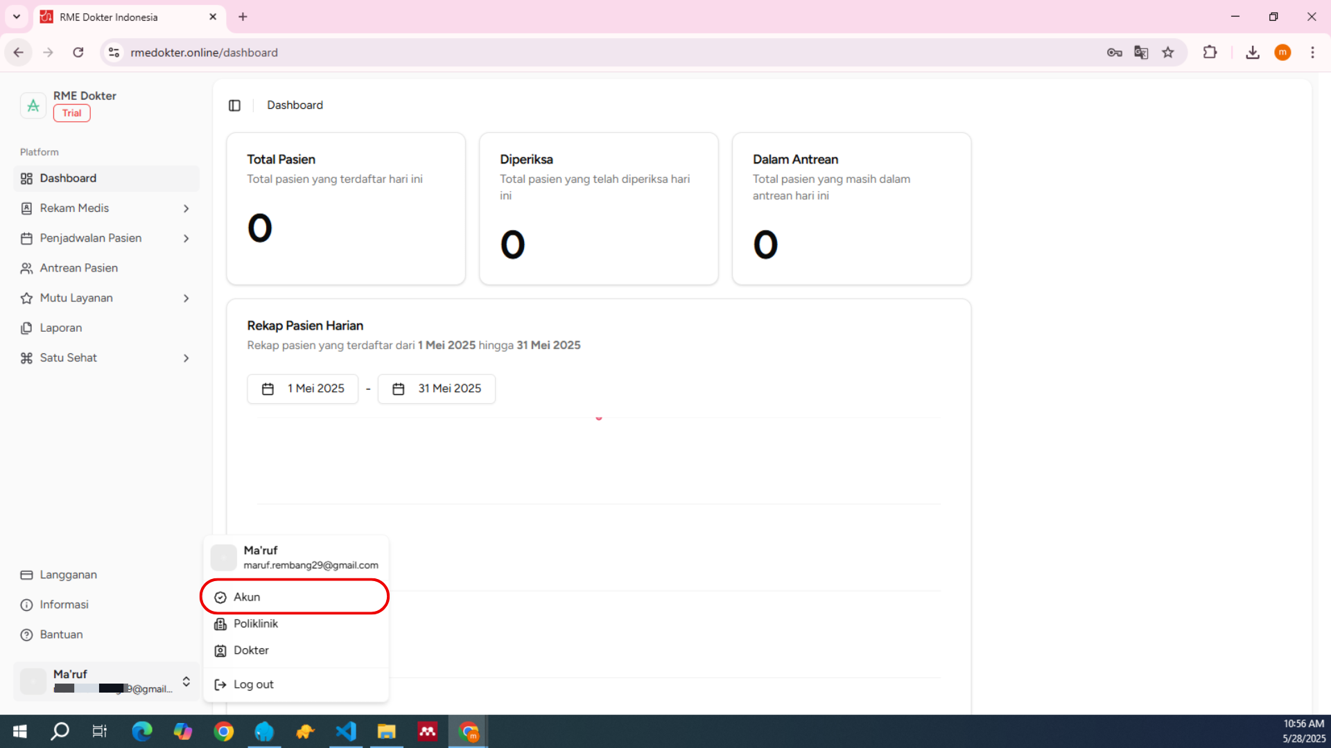Berisi informasi seperti nama lengkap, email terdaftar, serta peran akun Anda di RME Dokter Indonesia.