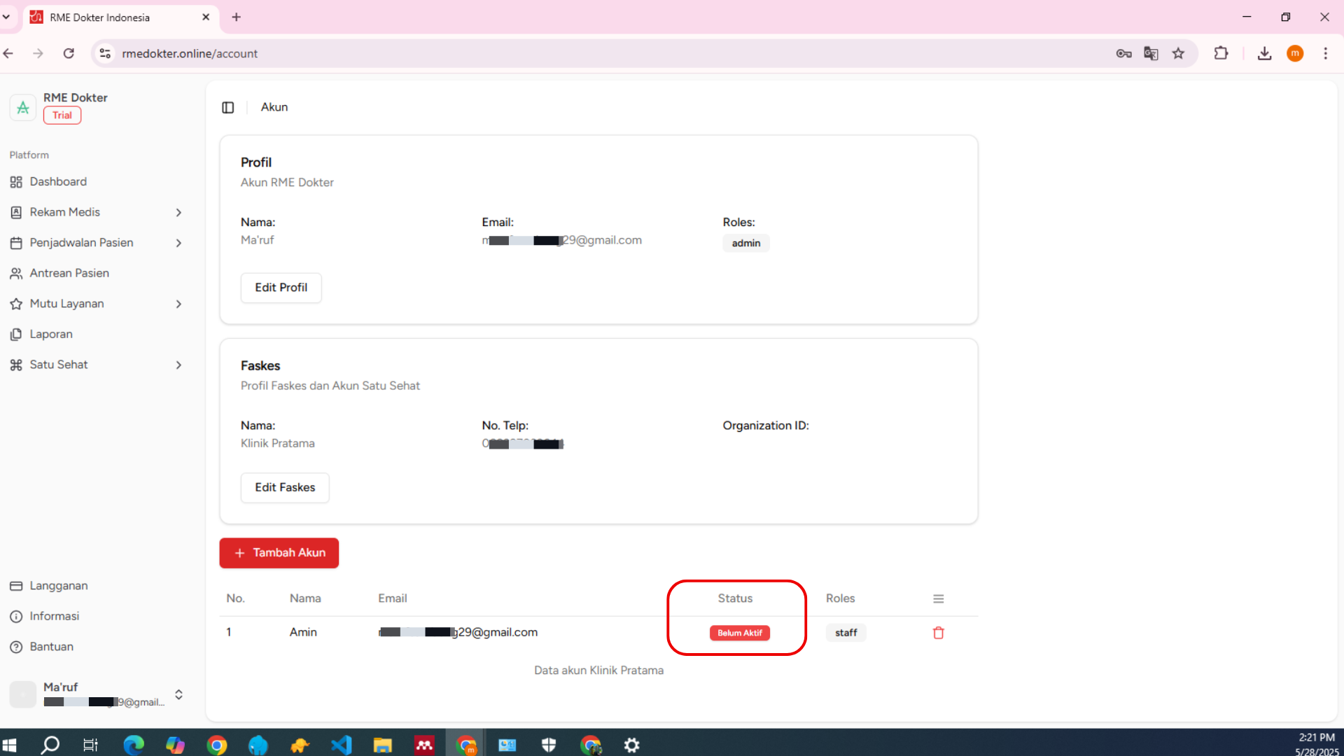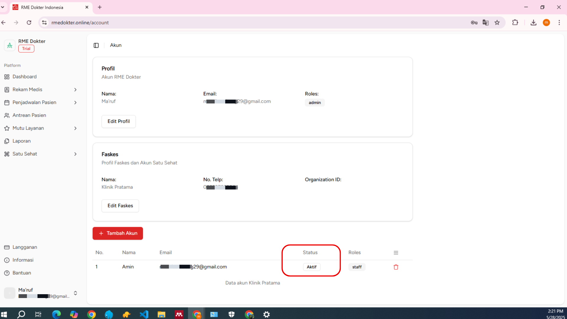 Jika verfikasi berhasil, Status akun staf Anda akan berubah menjadi Aktif. Akun staf baru sekarang sudah siap digunakan di RME Dokter Indonesia.